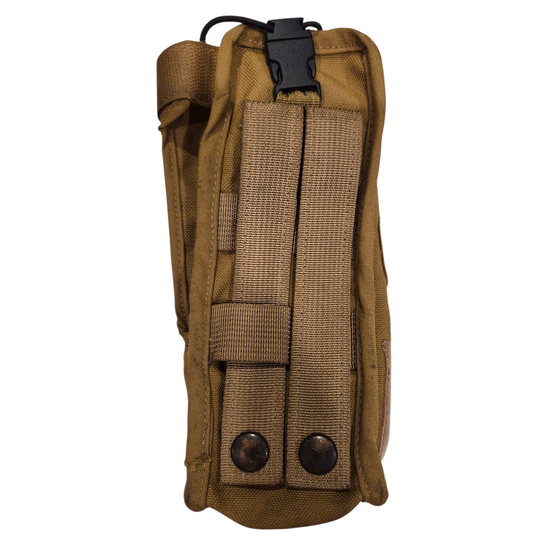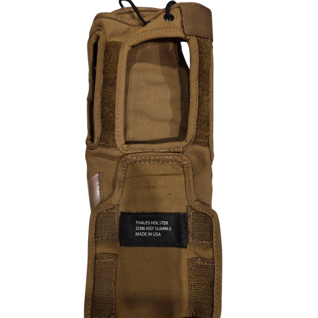 The holster is constructed from durable, military-grade materials in Coyote Brown, featuring a secure retention design compatible with standard MOLLE/PALS load-bearing systems. Its streamlined profile allowed operators rapid access to communications equipment while maintaining a low visual and IR signature in austere environments.
